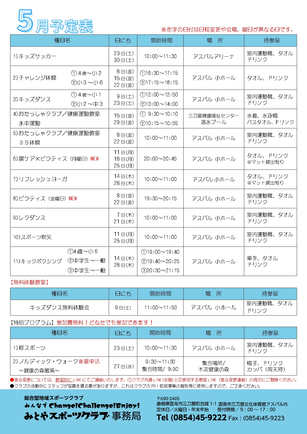 みとやスポーツクラブの令和8年5月の会報、予定表をアップしました。